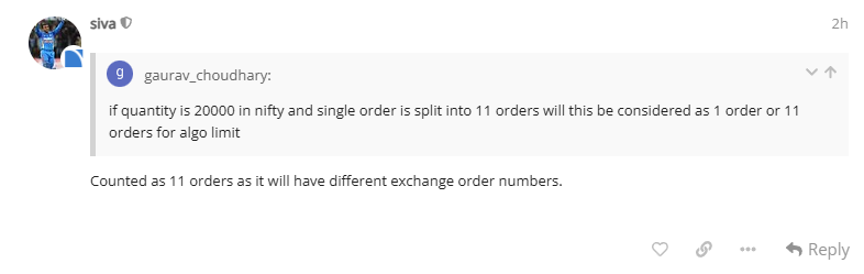 if quantity is 20000 in nifty and single order is split into 11 orders will this be considered as 1 order or 11 orders for algo limit @siva