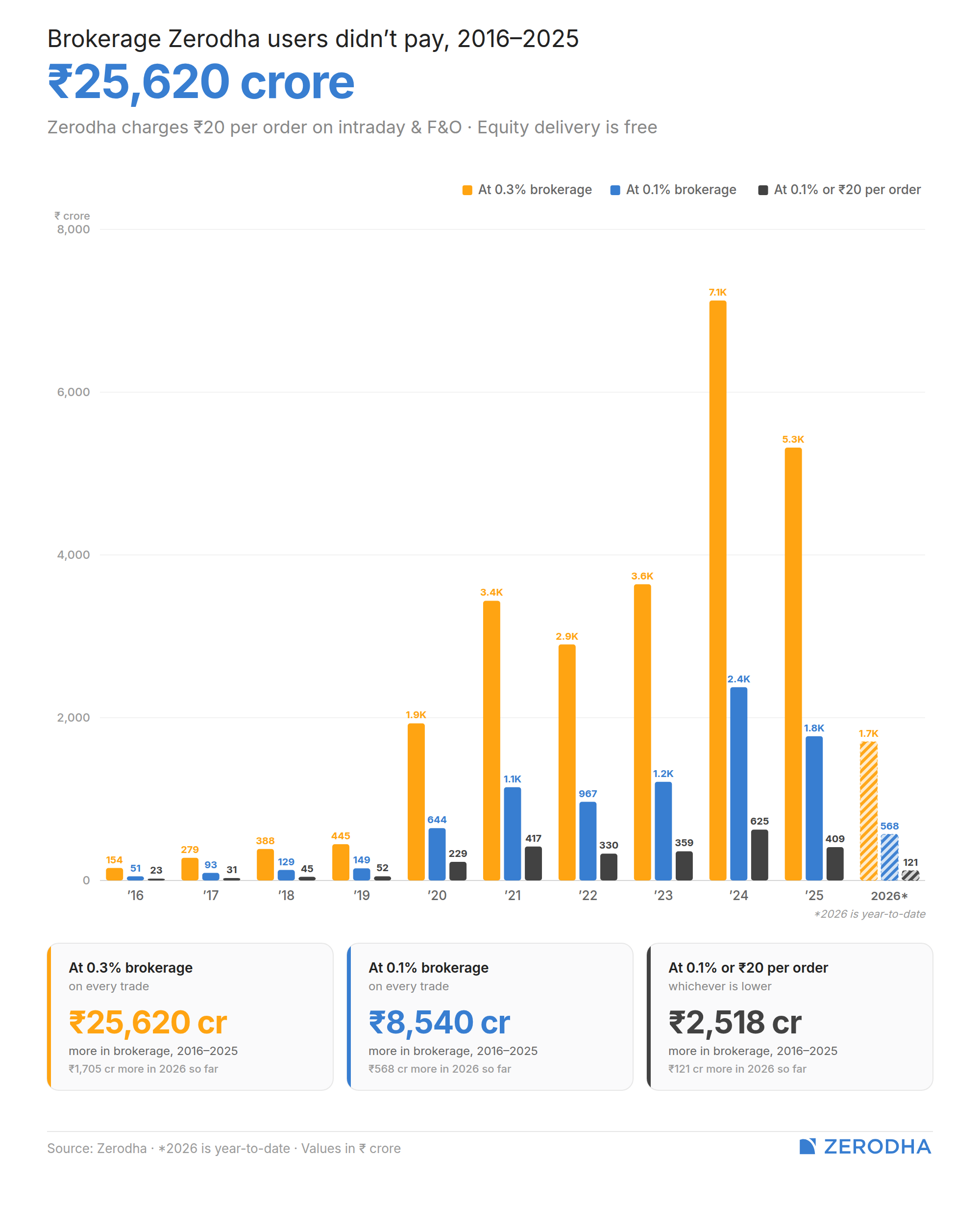 One example of us sticking to our philosophy: we still charge zero brokerage on equity delivery trades. We ran some back of the envelope math on how much Zerodha customers would have paid had we charged for it.