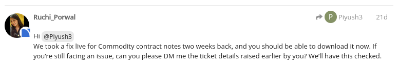 Console provides for requesting contract notes in various formats - PDF, XML etc. For commodoties, the XML format has been broken since atleast 2+ months. When one requests this, all that is received is a âNo contract note foundâ message. I raised this issue back in April with the support team at first and then here in the forums, and i suspect it was broken even before that.