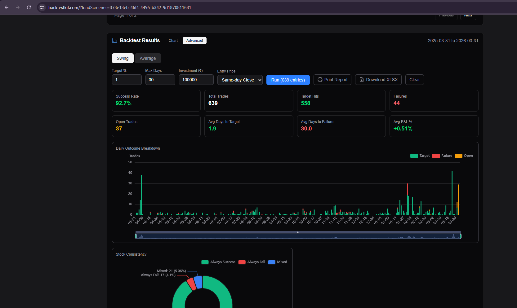 chartink is fine but it changes backtest result after each week and month ends and hence gives us wrong data for backtest, same problem for other screenering websites as well. sometimes it shows some instrument on monday and on friday it removes it from backtest result hence we see profit in the backtest but when we actually try that, it makes us do loss. instead i would recommend this: https://backtestkit.com, it provides accurate results and it does not change as time goes, you might not be happy with results sometimes but it will show you the truth which can help us enhance our stratergies. i personally use this screener: BacktestKit - Stock Screener & Accurate Backtesting for Indian Equity Market, look at the result: