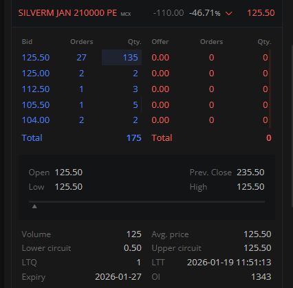 The current limit is ₹175.50. That means the exchange is allowing the option to trade at 35,000% of its fair value. They have built in a safety buffer for a 18% Silver crash in a single day (using a 4.8 Sigma stress test, far higher than the standard 3.5 Sigma).
