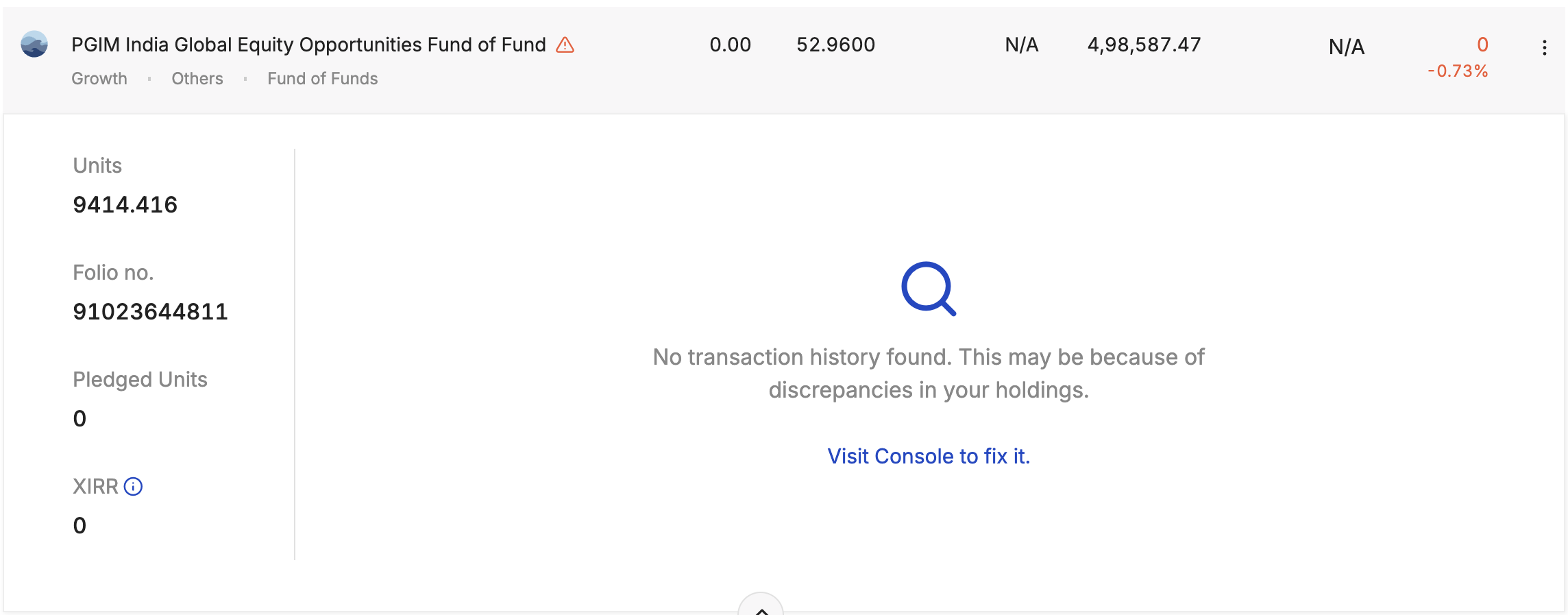 Hi @yashash , The discrepancy in holdings for PGIM India Global Equity Opportunities Fund of Fund has been resolved and updated on Console.