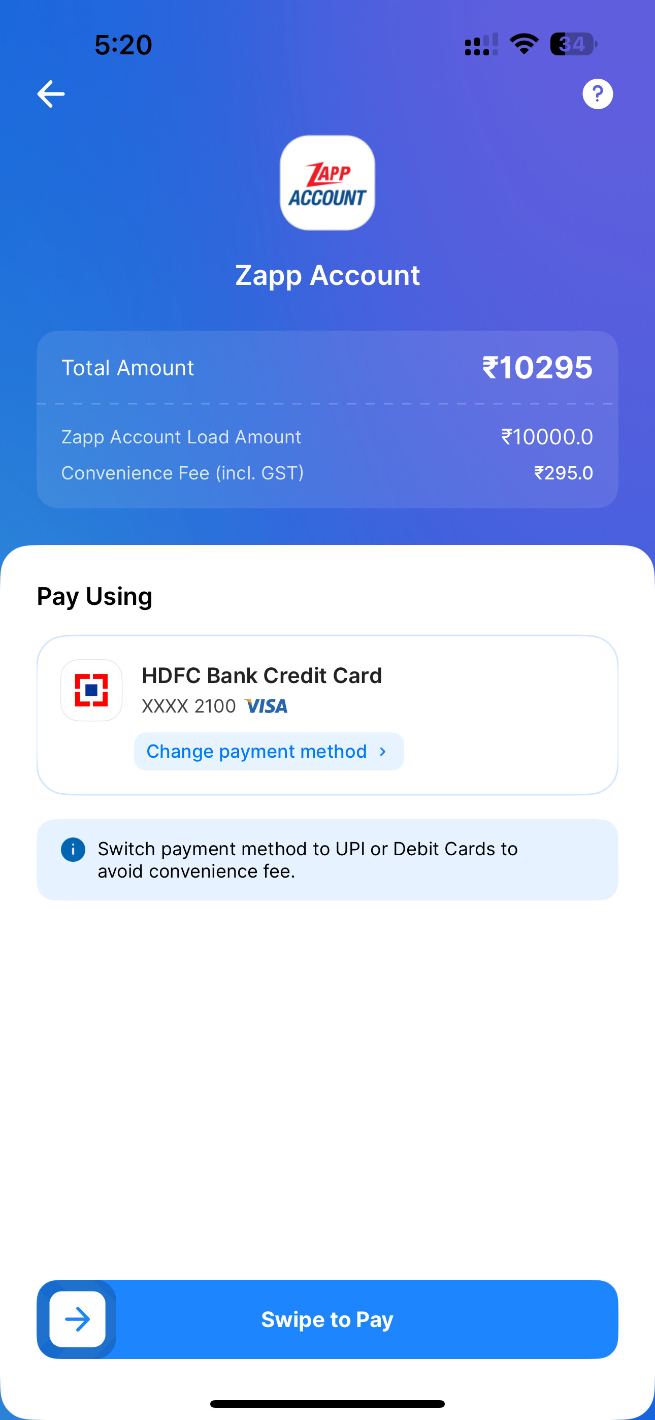 This convenience fee is only by PayZapp (HDFC)