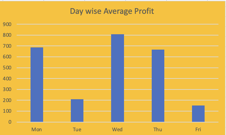 Here’s day wise average profits, obviously Wednesday are the days it has generated highest average profits compared to all other days and Friday being the least profitable day.
