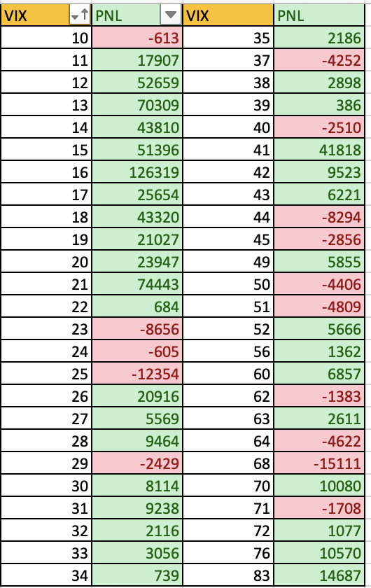 Here’s the VIX analysis with respect to 920 straddle over all profits. There is a large misconception that high vix would end up in loss, but the results shows that even in High Vix 920 straddle made money.