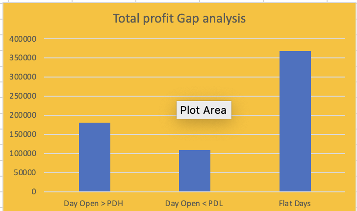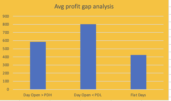Here’s total profits made during gaps, when day open is greater than previous day high, Day open < Prev day low and flat days. Irrespective of gaps, its able to generate profits over all. Even the avg profits denotes the same