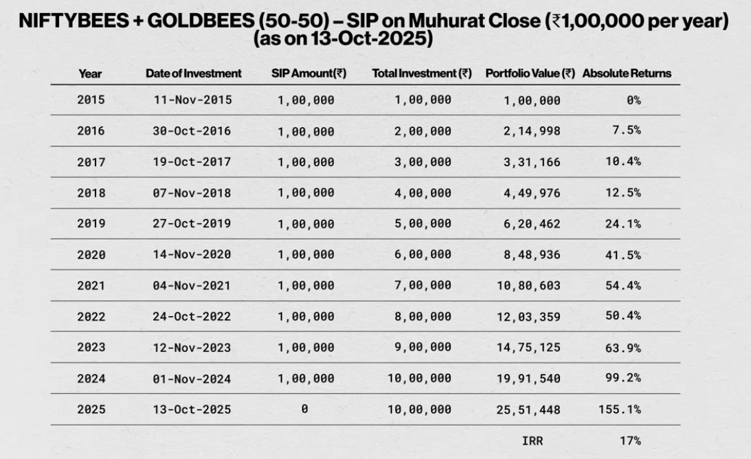 Let’s start with the first one — investing ₹1 lakh in NiftyBees every Muhurat Day for the past decade.
