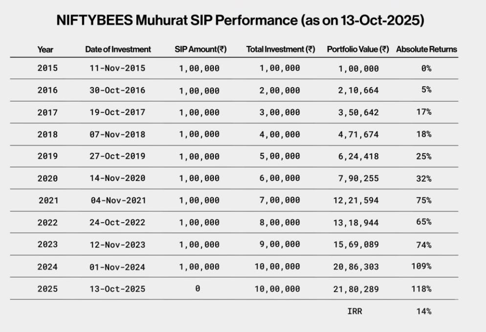 So here’s the question — what if you had invested ₹1 lakh every year on Muhurat Trading Day for the past ten years? Essentially, a once-a-year SIP made only on Diwali.