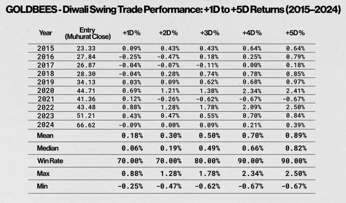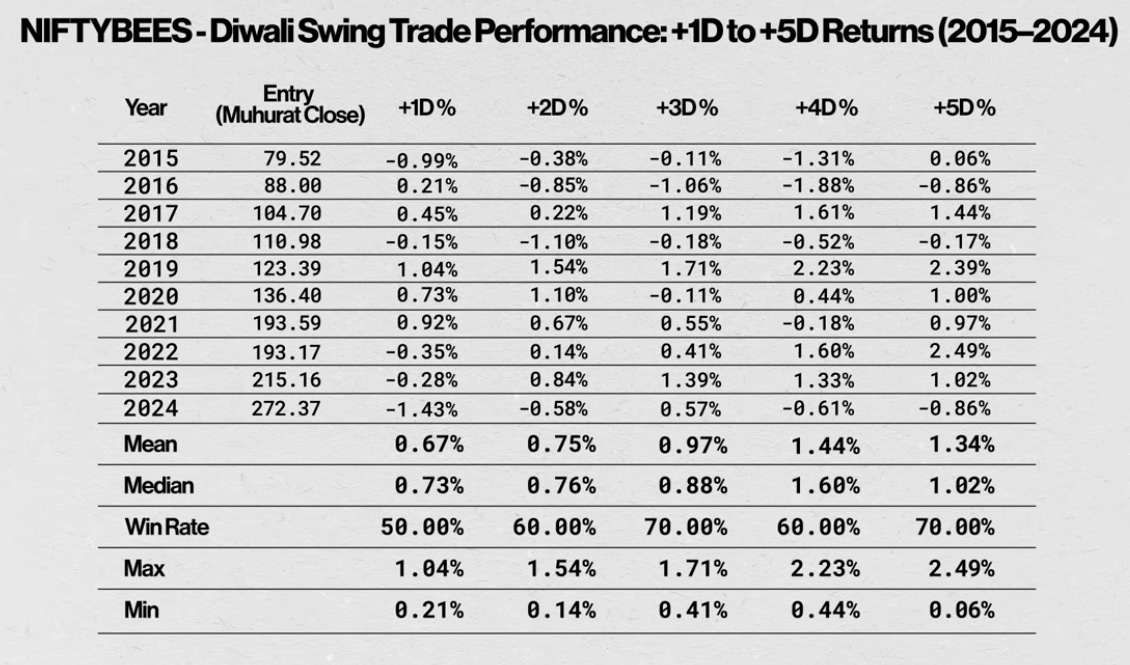 Title : NIFTYBEES - Diwali Swing Trade Performance: +1D to +5D Returns (2015–2024)
