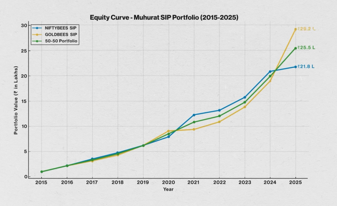 Next, let’s see what happens when we combine the two — investing ₹50,000 each in NiftyBees and GoldBees every Diwali.