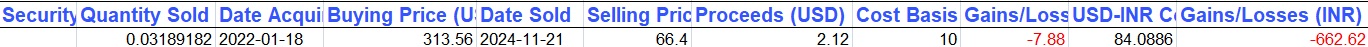 The loss is converted back to INR (notionally for reporting at mid rate) at the closing USD to INR on the sale date i.e 21.11.2024 ie 84.08 (7.88 x 84.08) This translates to 662.62.