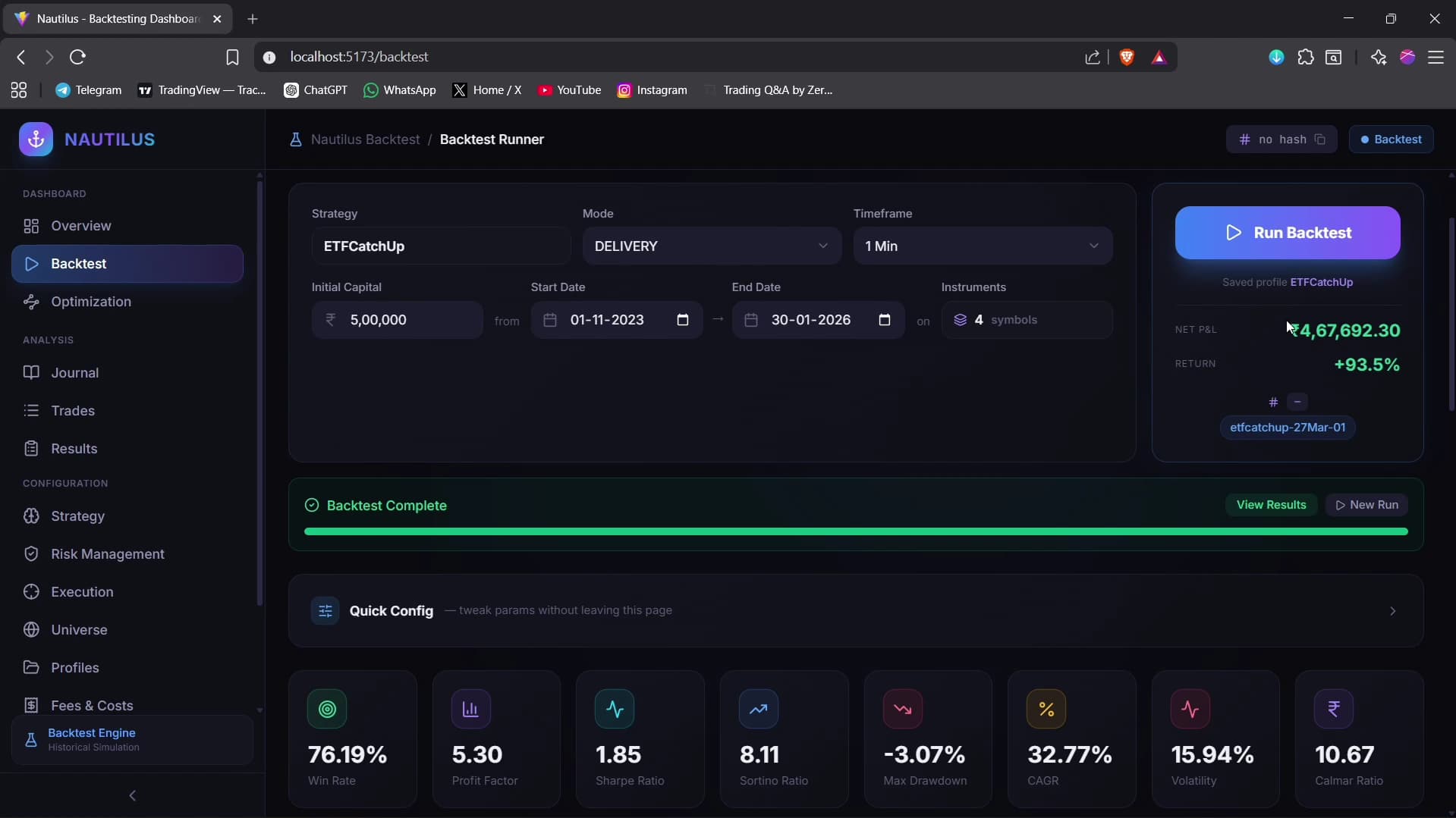 If the parent index moves significantly intraday, the corresponding ETF sometimes reacts late. So the strategy enters the ETF near the end of the day and holds for a few days with risk rules and time-based exits.
