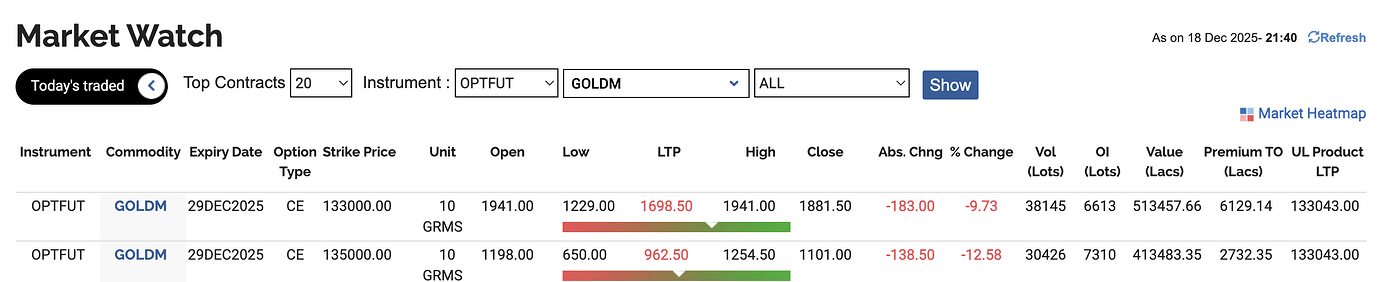In the above, we can see GOLDM price current at the time of above snapshot is Rs.133043. However, I cannot track this in Zerodha (kite). I can only see futures of subsequent months or options contracts. Similar for other commodities like COPPER, SILVER, SILVERM etc.