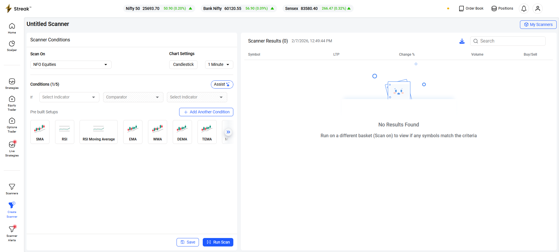 While setting up the scan, you can select from various baskets under “Scan On”, including NFO Equities. Also, all the conditions defined follow "Matches All” logic by default.
