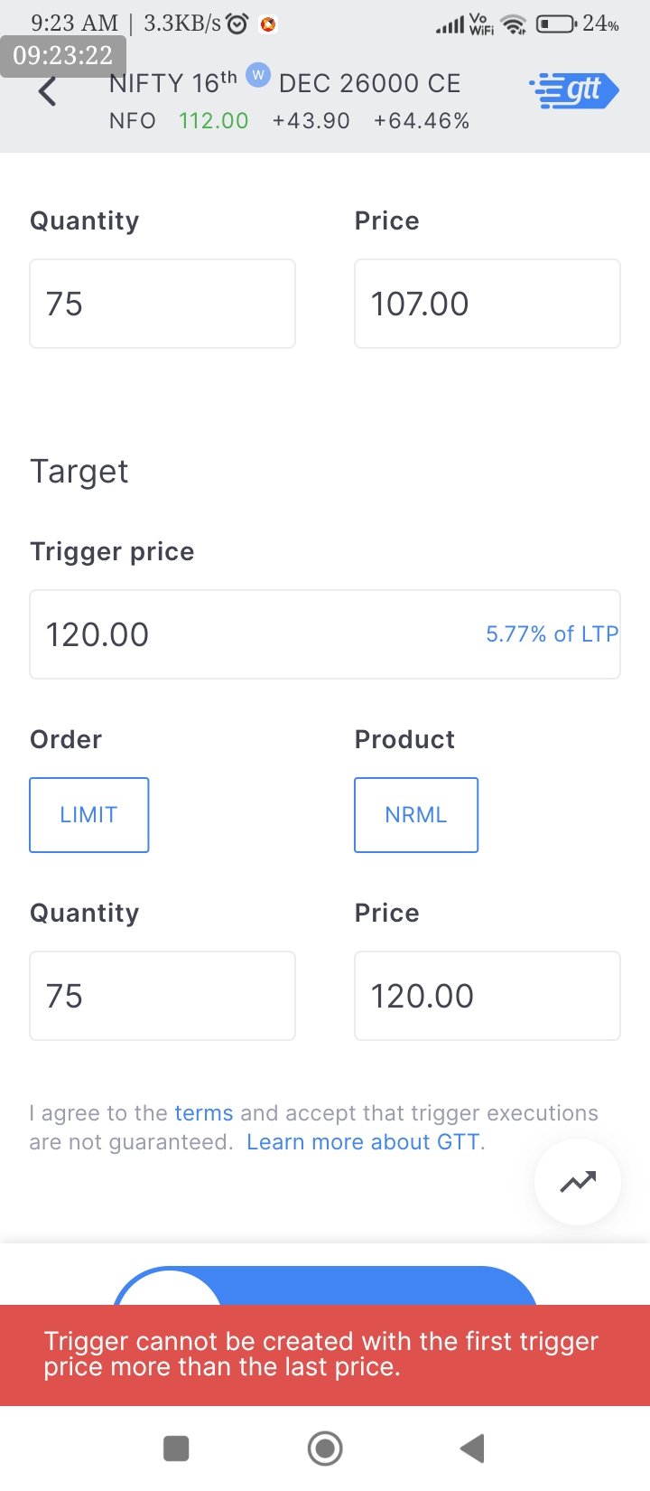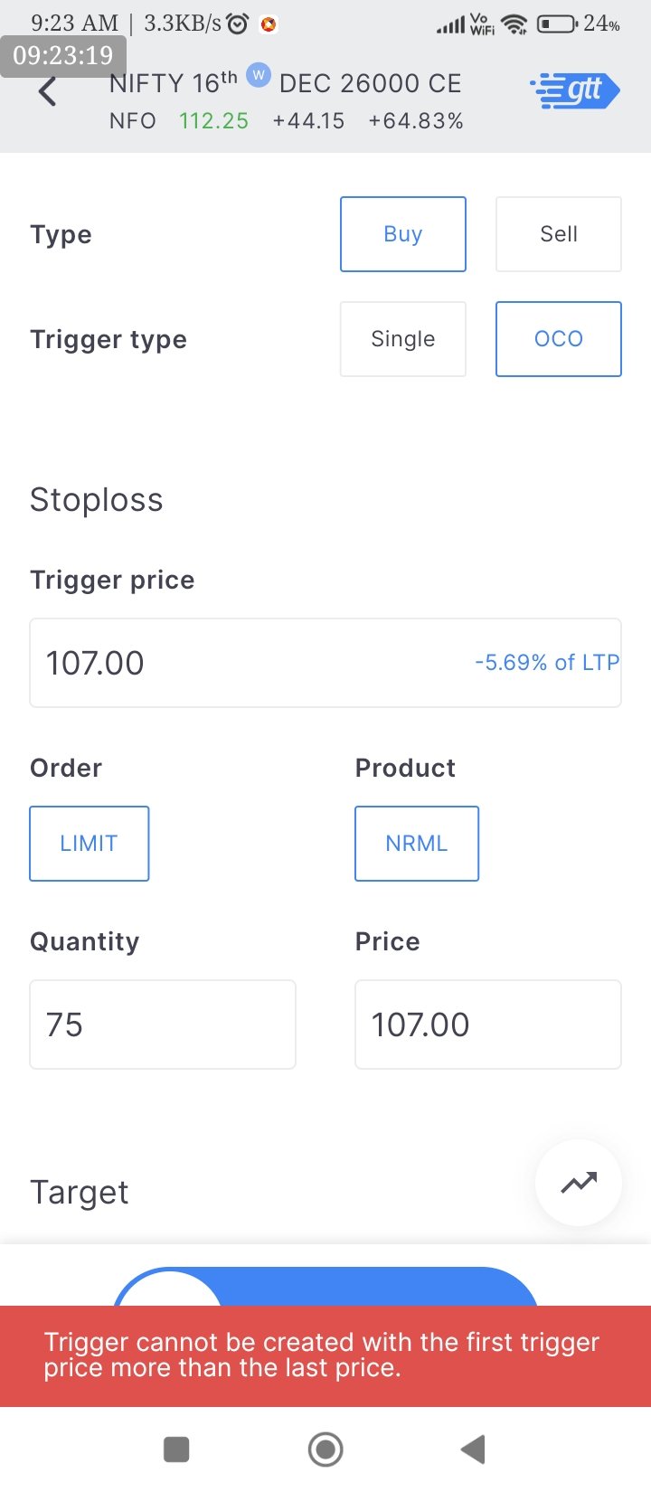 Summary of my trade: I bought the 26000 CE 16th Dec Nifty option at market price (it was around 113) and set a stop-loss at 107 and a target at 120. However, I was getting an error. Could you please check and let me know why this happened and how to mitigate it?