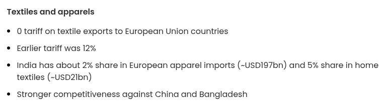 For India, this means labour-intensive exports — textiles, apparel, footwear — which is also the biggest chunk of India’s exports to Europe. The EU has agreed to eliminate tariffs (which ran as high as 12-17%) on these goods immediately upon the deal coming into force. More importantly, it levels the playing field with Vietnam and Bangladesh.