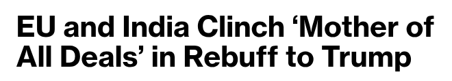 That, perhaps, is what India — an economy that has historically shied away from being integrated into world trade — has been thinking. It’s why, as we wrote at the start of the year, we have been signing trade deals left and right. And the EU deal represents the high point of our hedging strategy.