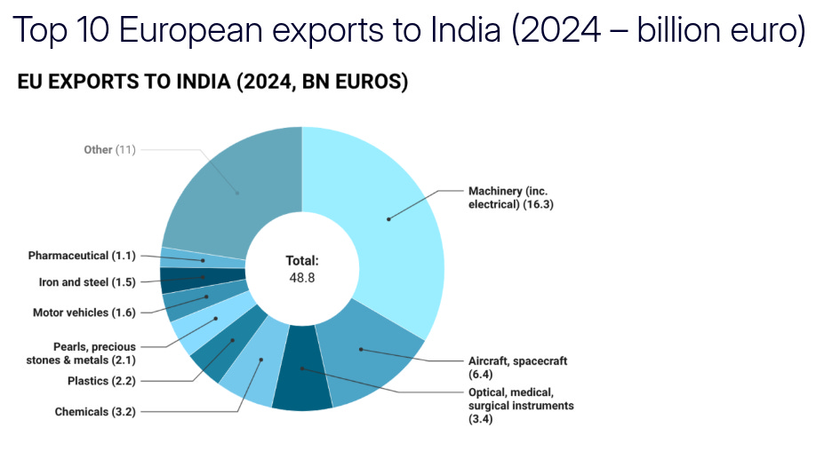 For Europe, the equivalent is capital-intensive machinery. India will slash tariffs on EU machinery from as high as 44% to zero over 5-10 years. Aircraft duties will also be eliminated. These are sectors where India isn’t trying to build domestic champions (yet) — we simply need the equipment to industrialise.