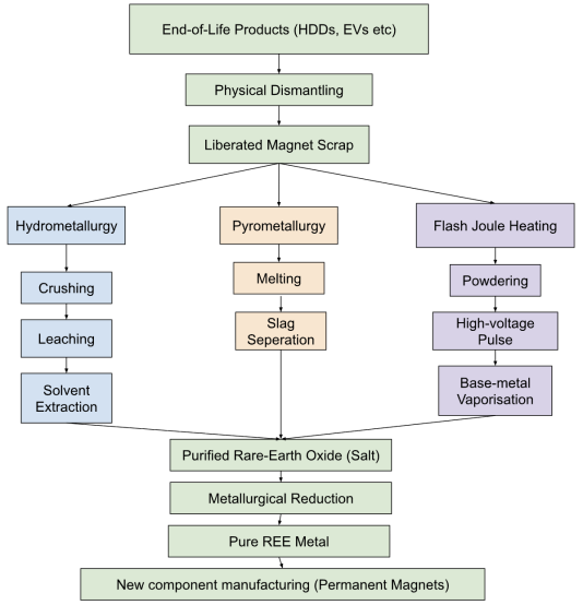 First, there’s hydrometallurgy — the most common technique, and the closest thing to processing ore. Here, we crush magnets into powder or granules, and treat the crushed material with strong acids that leach away the metals inside. From that dissolved metal, we then use special solvents to pull out the rare earths we need.