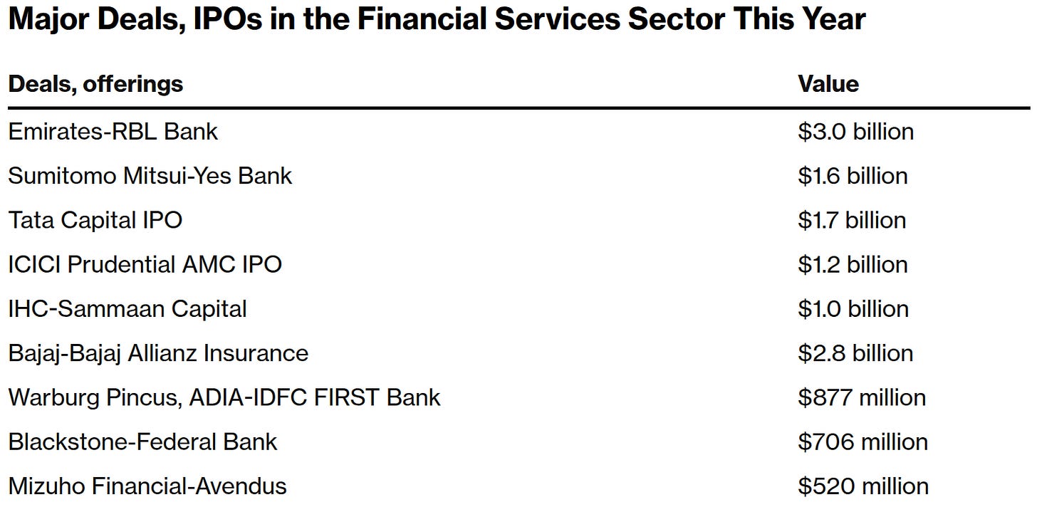 Of course, India, the fastest-growing major economy in the world, is an attractive playground for global capital right now. Indian banks and lenders are benefiting from rapid digital adoption, pro-growth government policies, and a stable regulatory framework. That also explains large deals in this sector for the year. Japanese megabanks have openly voiced their enthusiasm towards this too.