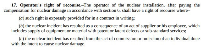 Indian lawmakers introduced a liability law that held all parties, including suppliers of nuclear technology and materials, responsible for damages in case of an accident. The law capped the operator’s liability at ₹1,500 crore, but its most controversial provision was Clause 17(b), which allowed NPCIL, the state-owned nuclear operator, to seek compensation from suppliers if their equipment was found to have caused an accident.