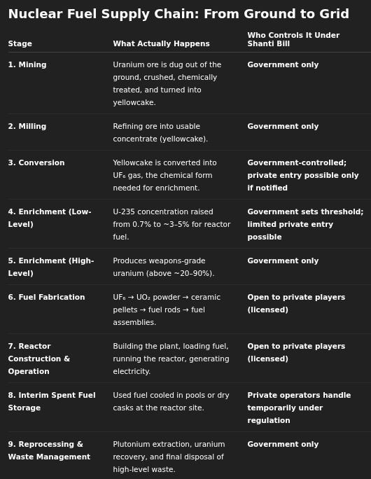 That’s a big deal. But it does not mean India has completely thrown open the nuclear sector. The government has been careful about where the lines are. To understand those lines, however, you need to understand how nuclear fuel moves from the ground to the grid.