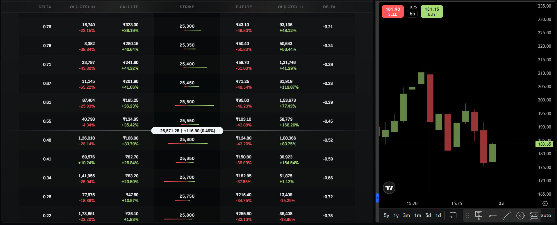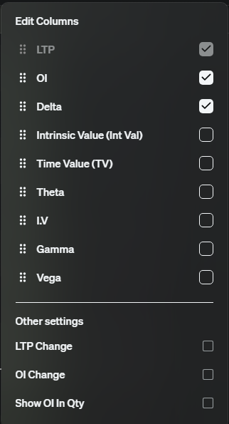 - Column Customization in Option Chain – There are too many unnecessary columns (IV, Vega, Gamma, Theta, etc.). I only need OI and Delta. Currently, I have to scroll left/right or expand the panel , which is poor UX. There should be a column edit/customization control. Look at how 915 (Groww) has implemented it , much cleaner and user-focused.