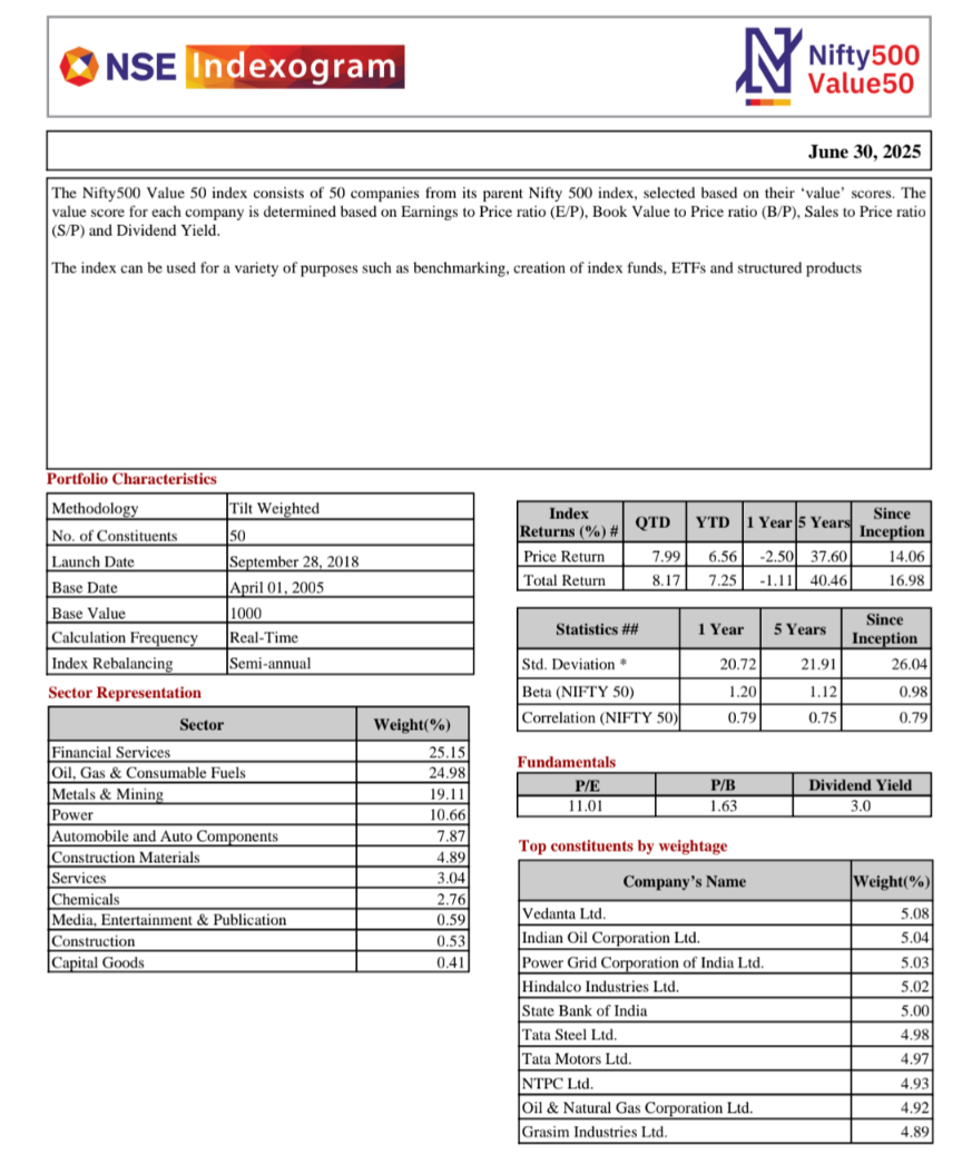 The NIFTY500 Value 50 Index picks 50 stocks from NIFTY500,