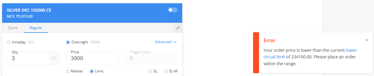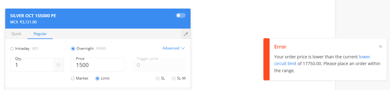 e.g. Silver 155000 P.E current premium is 3121. I tried to place AMO buy order at 1500 but getting this error “Your order price is lower than the current [lower circuit limit] of 17750.00. Please place an order within the range.”