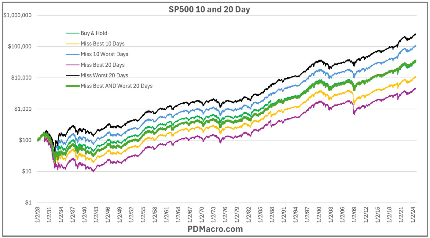 While one may try to avoid exposure to the volatile assets in the markets during the worst days, by doing so, one almost definitely ends-up also unable to be exposed to the volatile assets on the best days (closely clustered to worst days), which effectively provide returns close to a buy and hold approach.