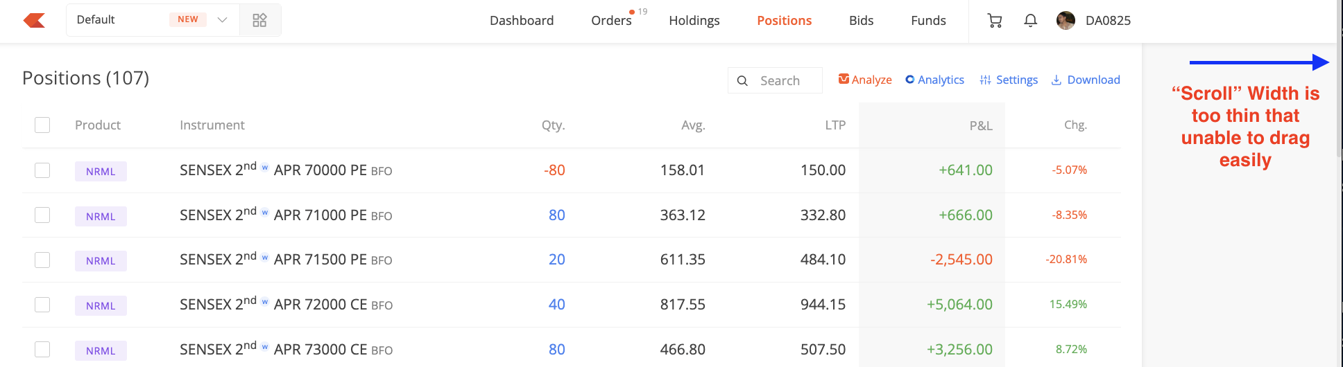 In KITE web scrollbar is very thin & is not properly coming in mouse pointer. In time of quick market moves, I having large position facing issue to drag & see all the positions quickly.