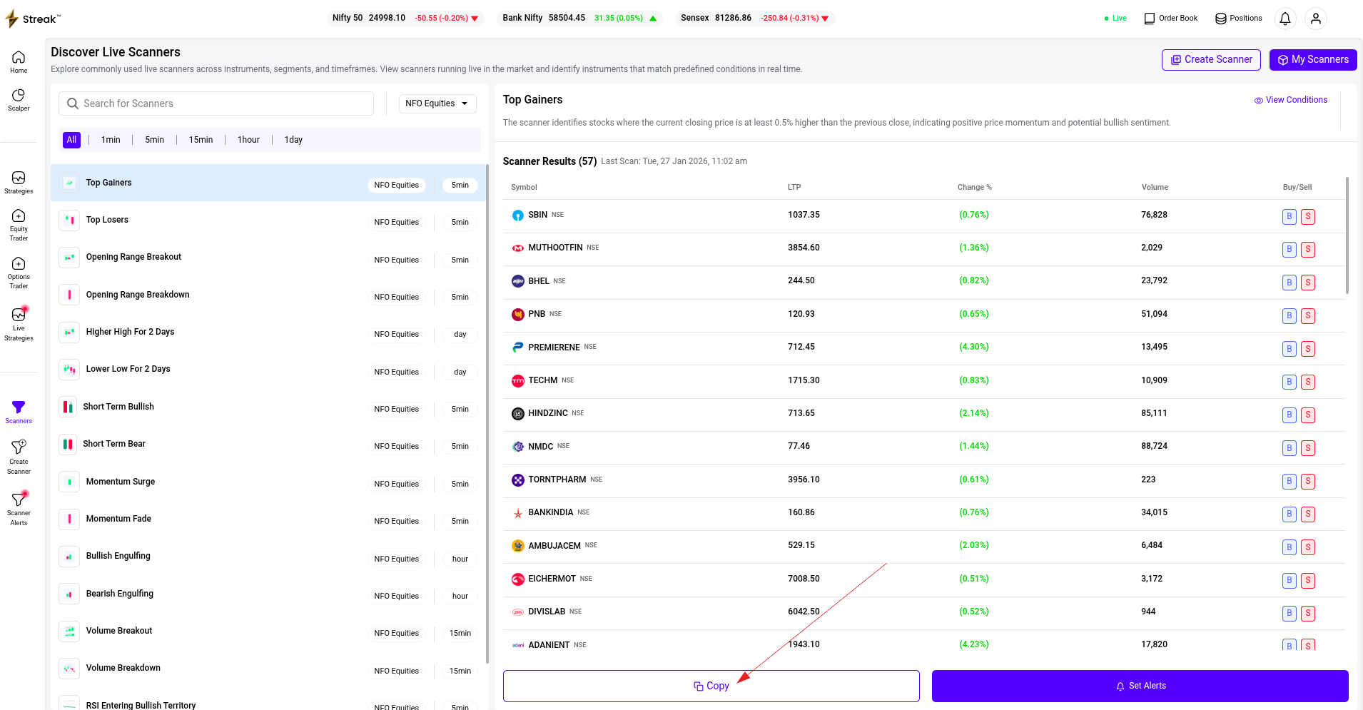 In Scanners i am not able to find NFO futures and no OR option available while creating conditions for scanner and no alert frequency selection option directly its taking 5 mintues as frequency