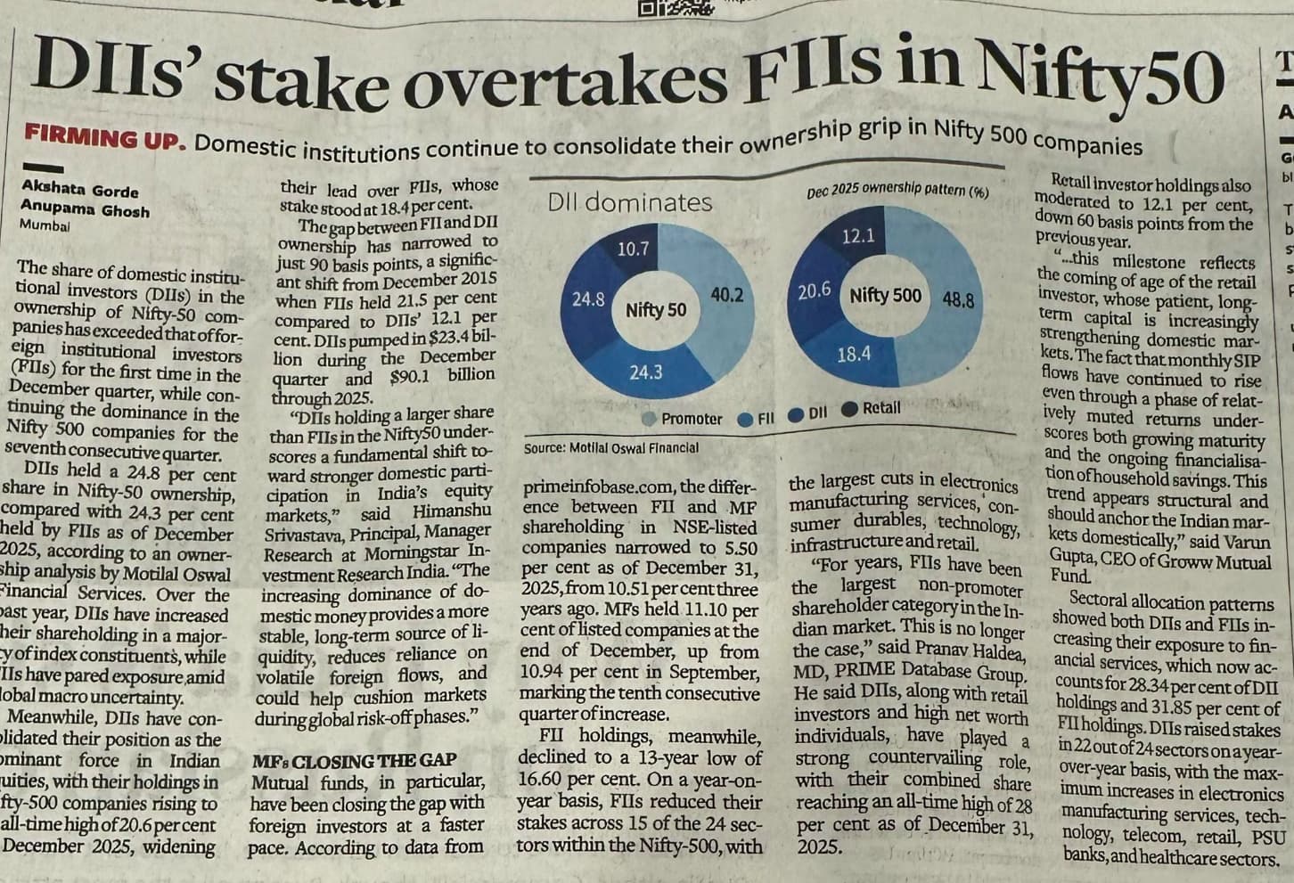 For the first time ever, Domestic Institutional Investors (DIIs) now own more of the Nifty 50 than Foreign Institutional Investors (FIIs).