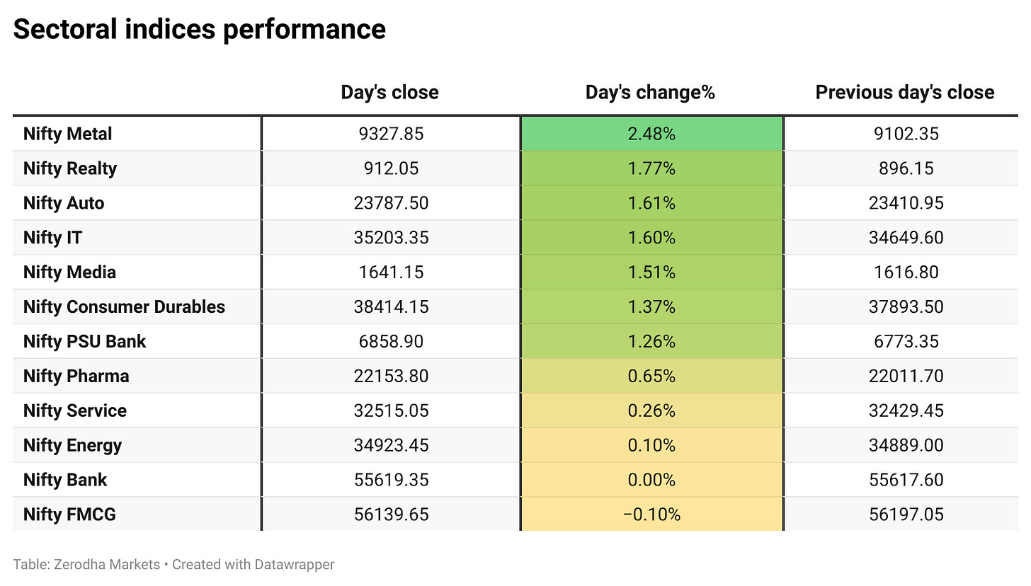 Nifty Metal was the top-gaining sector, rallying 2.48%, followed by Nifty Realty and Nifty Auto, which rose 1.77% and 1.61% respectively. On the other hand, Nifty FMCG was the only sector to close in the red, slipping 0.10%, making it the worst performer of the day. Out of the 12 sectoral indices, 11 ended in the green while only 1 closed lower, reflecting broad-based market strength.