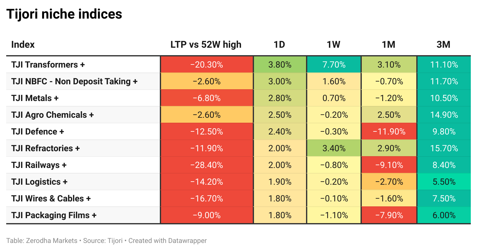 Tijori is an investment research platform, and they have constructed niche indices for various themes and sub-sectors. They help you understand the market performance of narrow slices of the market. You can also track the Promoter buying and other interesting stuff like Capex activity by the companies in the Tijori App’s idea dashboard