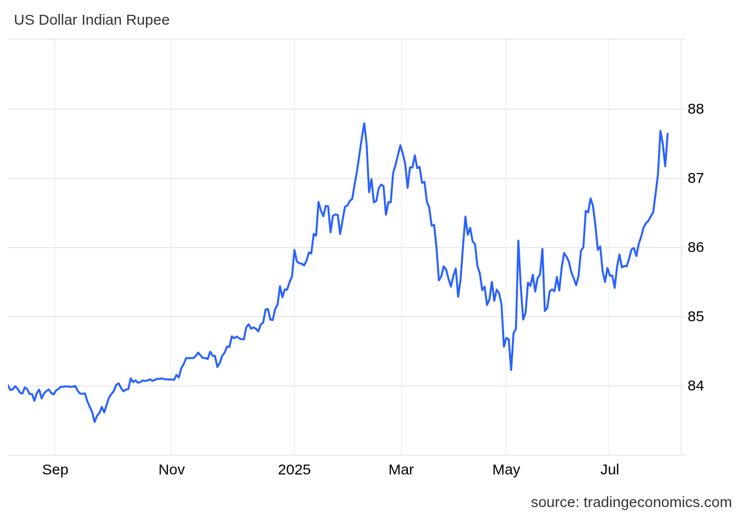 The Indian rupee fell past 87.7 per USD in August, its weakest since February, amid US tariffs, trade tensions, and a dovish RBI. Inflation dropped to 2.1%, prompting expectations of further rate cuts, while political tensions rose over India’s energy trade with Russia. Dive deeper