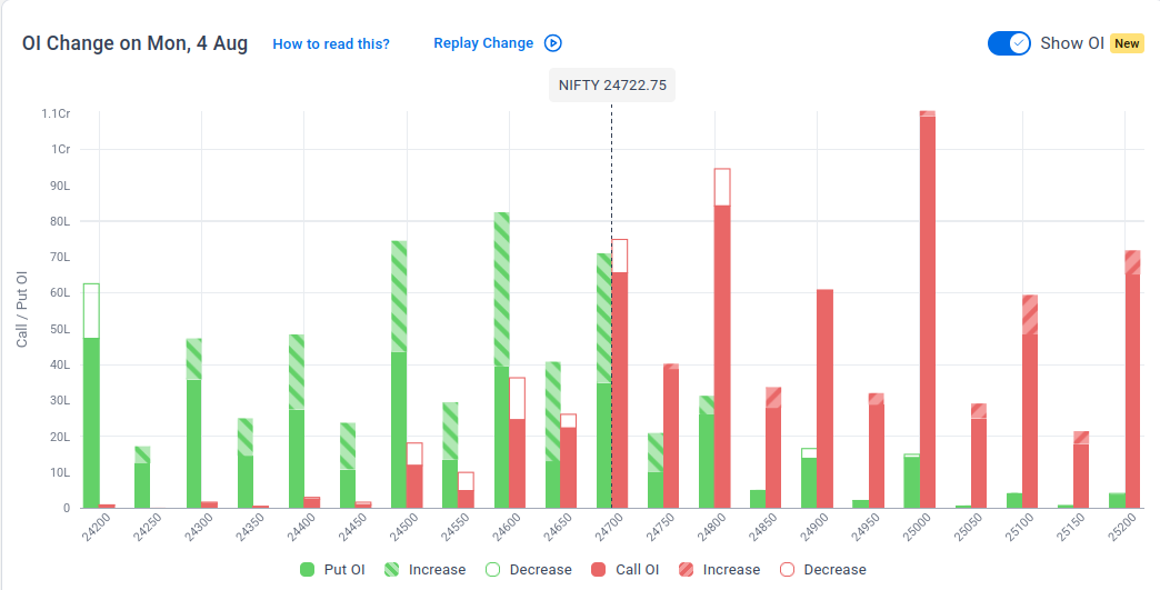 - The maximum Put Open Interest (OI) is observed at 24,600, followed closely by 24,500, suggesting strong support at 24,600 to 24,500 levels.
