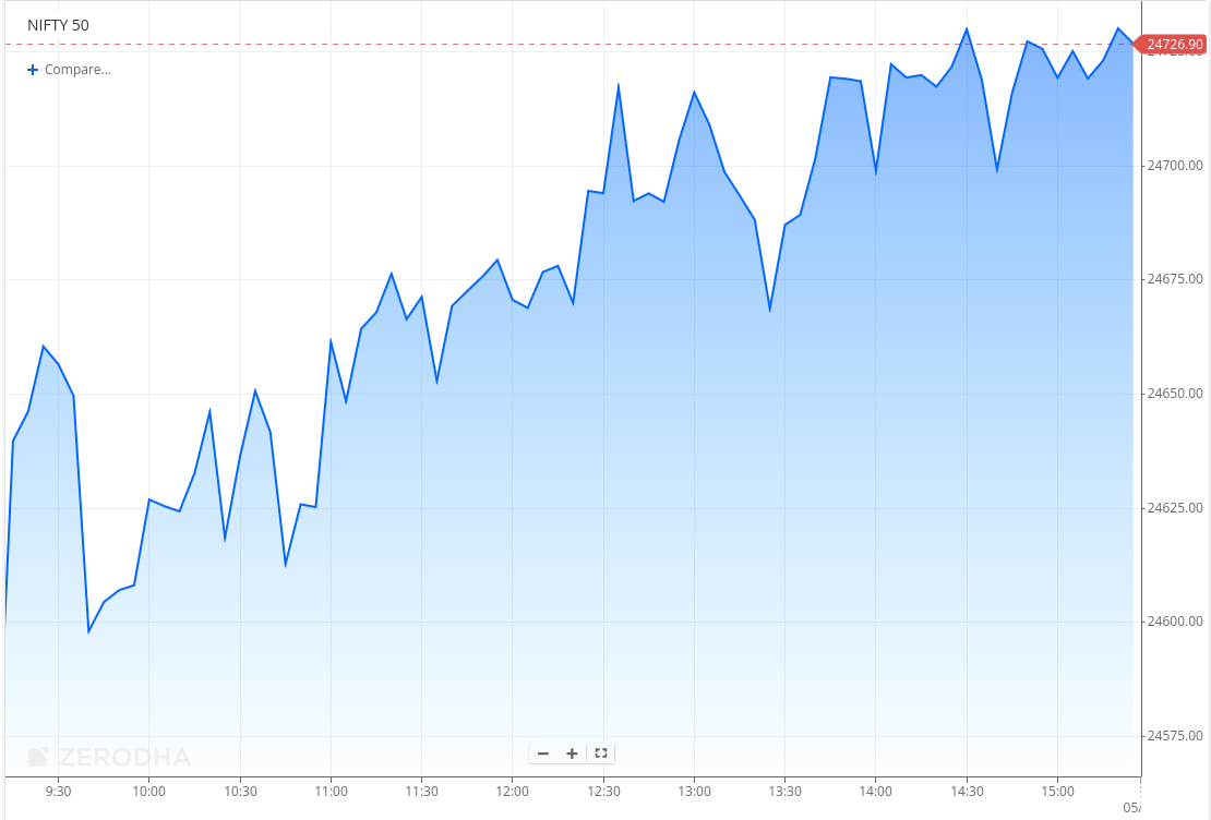 Nifty opened with a 70-point gap-down at 24,596 but quickly recovered to fill the gap, reaching near 24,660 within the first 20 minutes. However, the index slipped again, falling by 100 points to test the 24,550 level, all within the first hour. Post that, Nifty gradually moved higher, crossing 24,700 around 12:45 PM and remaining above that mark for most of the second half. It eventually closed near the day’s high at 24,722.75, up by 0.64%.
