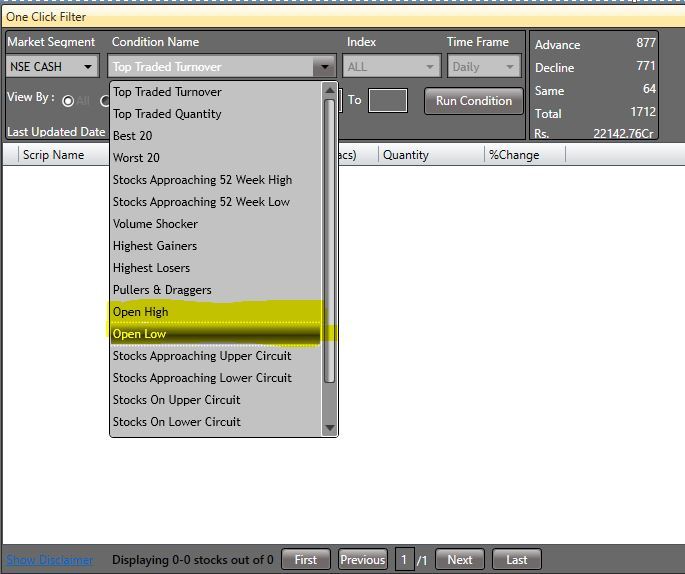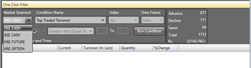 I am using Zerodha PI and find it very useful for writing our own script to screen the market. I have sharekhan trade tiger application and there is a filter called “one click filter” which I found very useful to screen the market quickly. There is an option to screen cash segment and F&O segment which I found very useful.The filter like open=high and open=low can quickly give you the result of the bullish and bearish stock from cash and F&O. It will be more helpful if you introduce the similar feature in Zerodha PI to screen the market. Please refer the below screenshot.