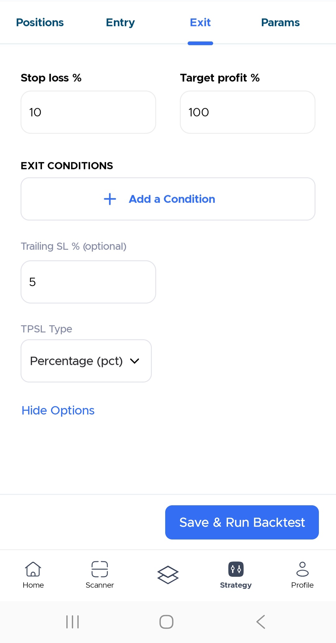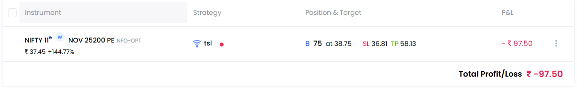 If you are entering a Long position in your strategy and select the target profit (TP) as 100%, Stoploss (SL) as 10 %, and Trailing Stoploss (TSL) as 5 %. Then, every time the position moves up by 5 % which is the assigned value for TSL, the SL will be revised by 5%.