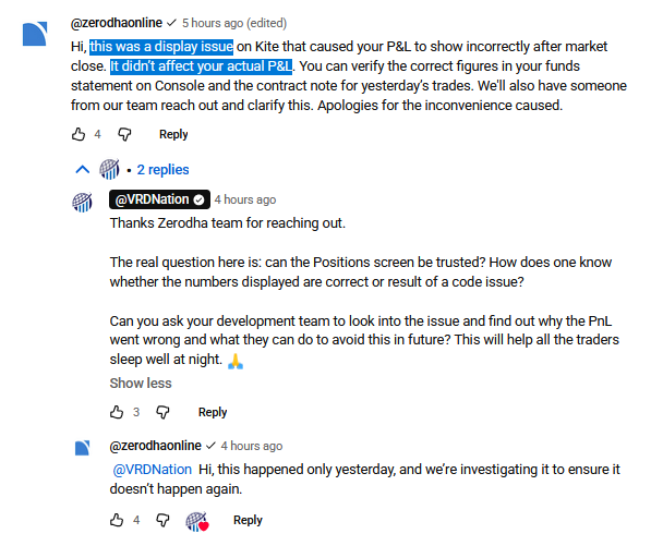 Also i also got this fear that this was actually stated so because it became public. What if the person never noticed. Would it still be a display issue or zerodha too wouldn’t notice and won’t rectify and it continued to error, resulting in losses for that user.