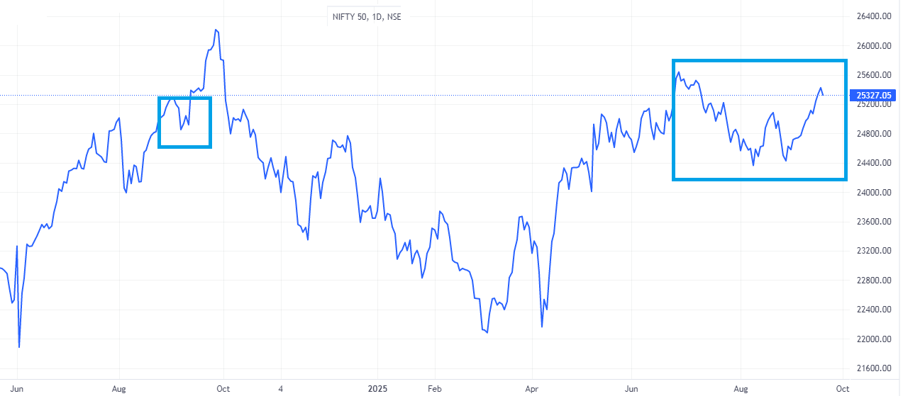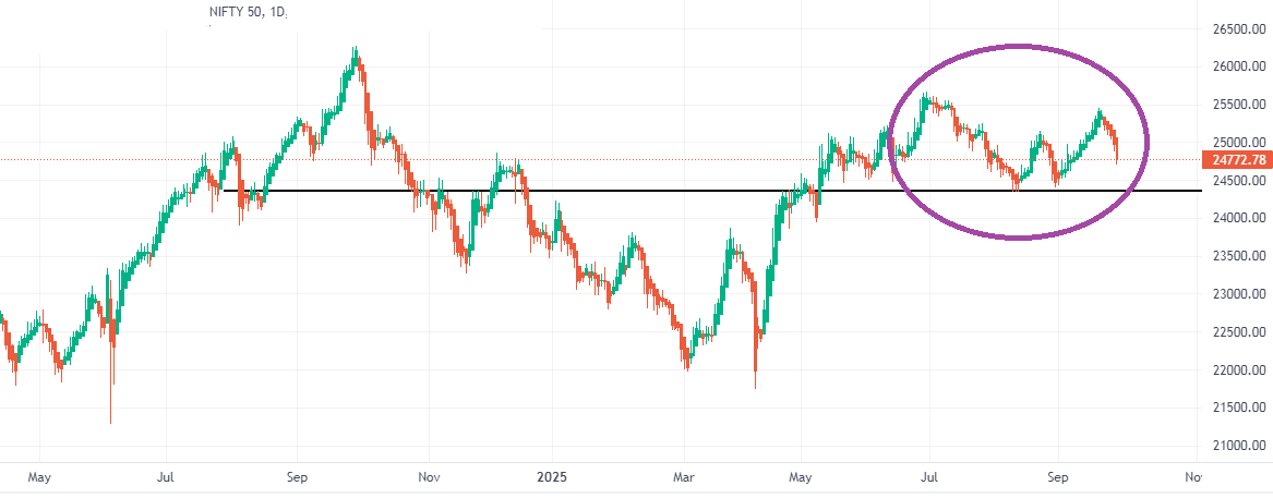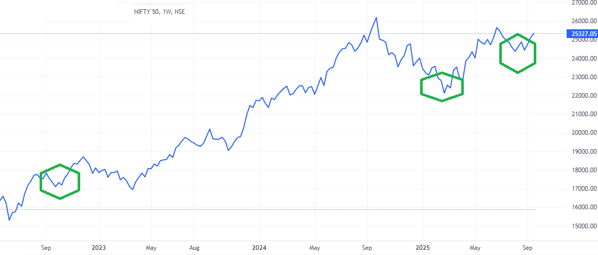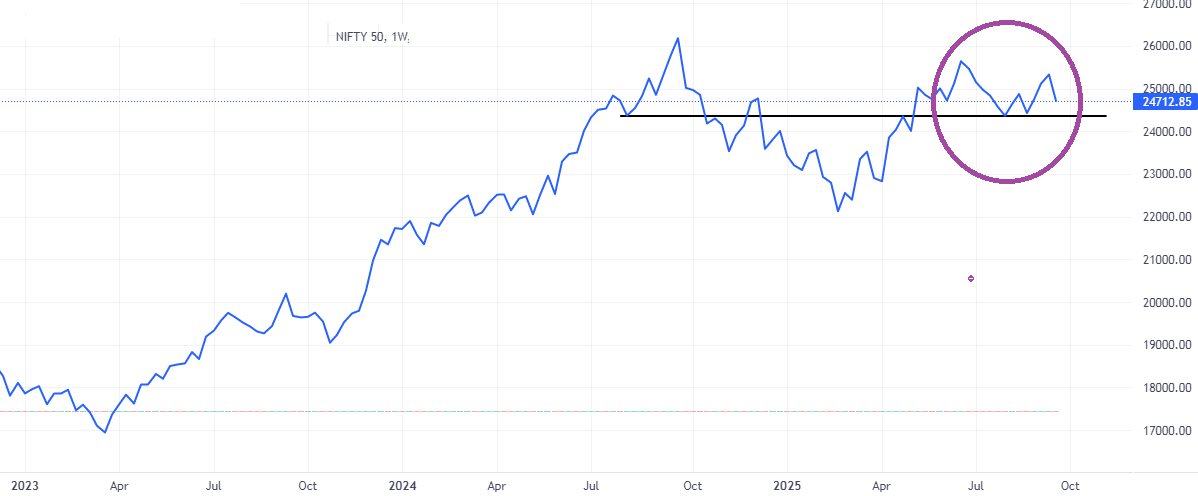 i was studying a chart pattern โWโ format which was developed on Daily & weekly chart of Nifty , W format was a bullish sign but in my experience after a run up , this pattern will fail on shorter TF but works well on longer TF , now the interesting thing is that the format is visible on Nifty daily & weekly , as a study for the future on back drop of Trumps H1B visa order , posting here