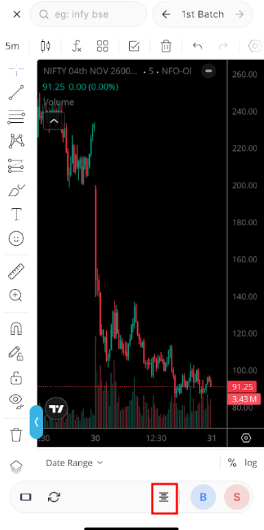 Easily move back and forth between charts without closing them. If a chart is opened from the Watchlist, you can move to the previous or next instrument in that list. The same applies to Positions, Orders, and Holdings, as charts can be moved between instruments available in that section.