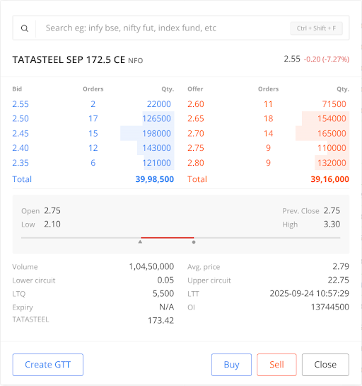 For example, Tata Steel trades at around ₹172, with an F&O lot size of 5,500. Its at-the-money option is quoted at ₹2.55–₹2.60. That 5-paise spread equals an impact cost of ₹275 per lot (₹0.05 × 5,500).