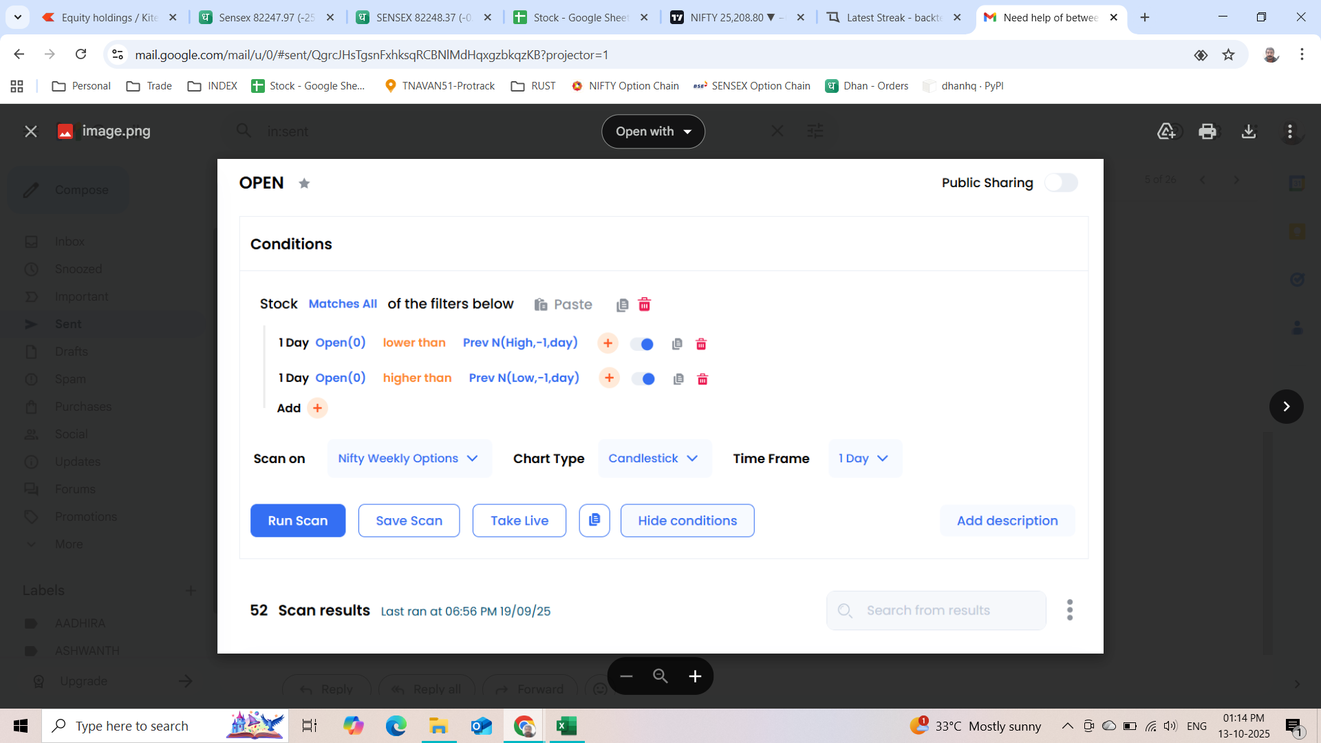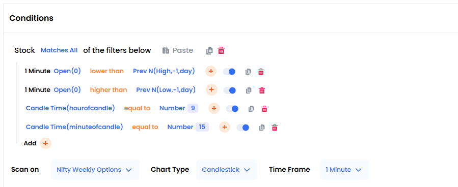 My condition is simple i want option data scanner with condition that open price is between yesterday high and low