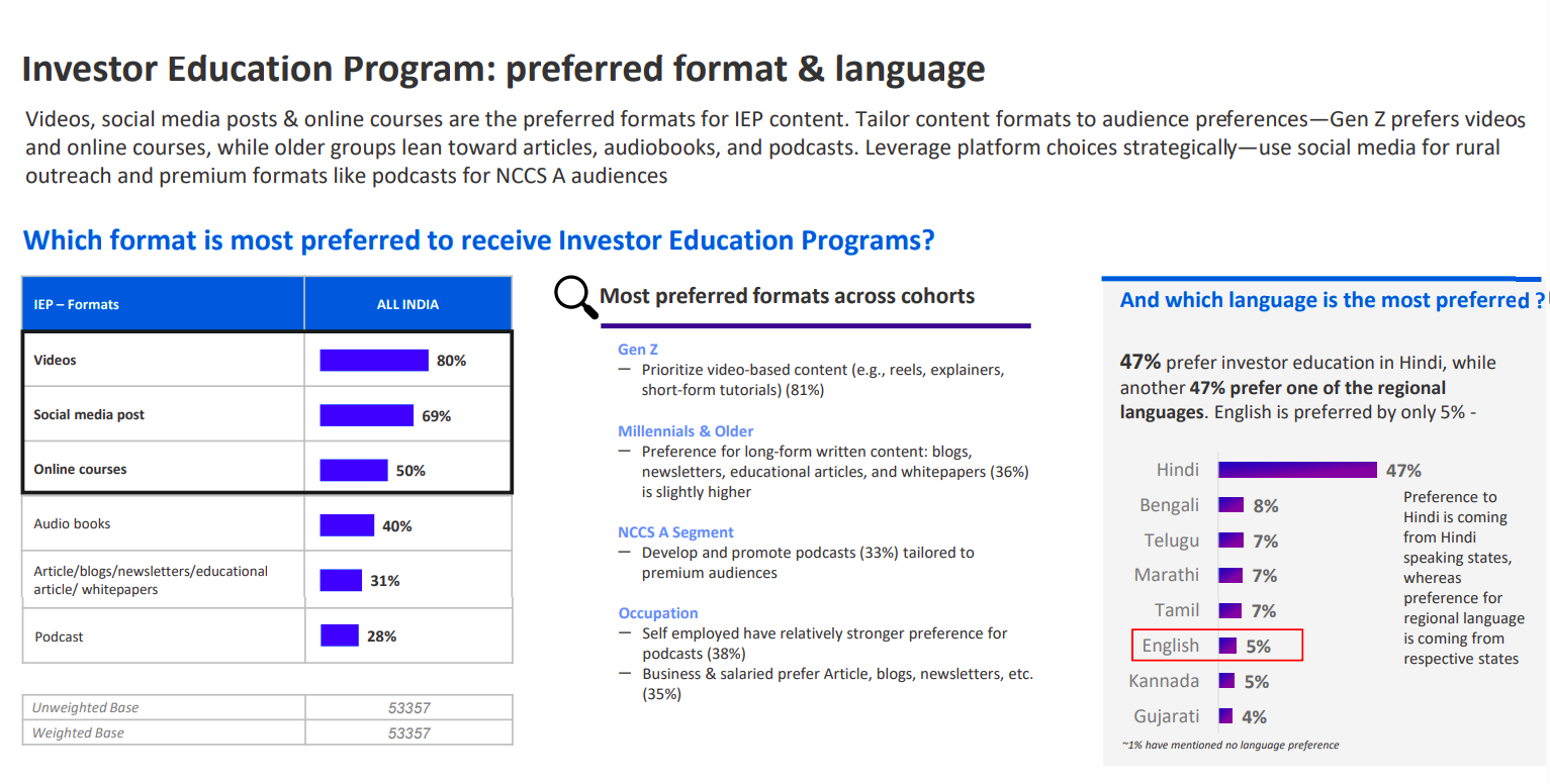 Only 36% of actual investors have decent knowledge about markets. And people across the board want financial education in their regional languages, not just English. Gen-Z wants short videos and reels, older folks prefer articles and workshops.
