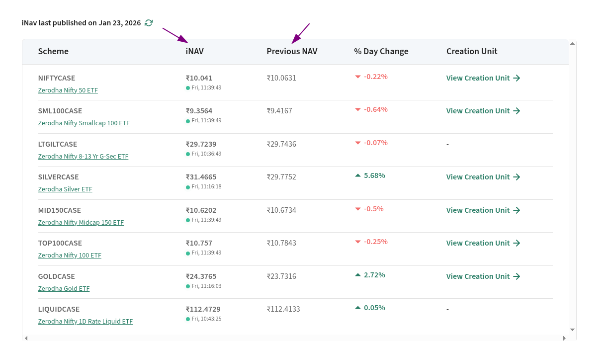On this page, Zerodha was displaying a live iNAV of around 31 (or higher) on 22 January 2026 at approximately 3:00 PM. However, today (23 January 2026) the same page shows the previous day’s iNAV as 29.77.