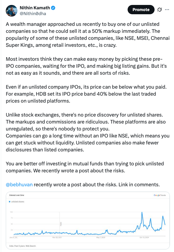 The biggest risk lies in the lack of regulatory clarity around ownership, which can result in low liquidity and sharp valuation swings—common in unlisted markets. A recent example is HDB Financial Services. You might buy at price X in the unlisted space, only to see the stock list 50% lower when it hits the public market.