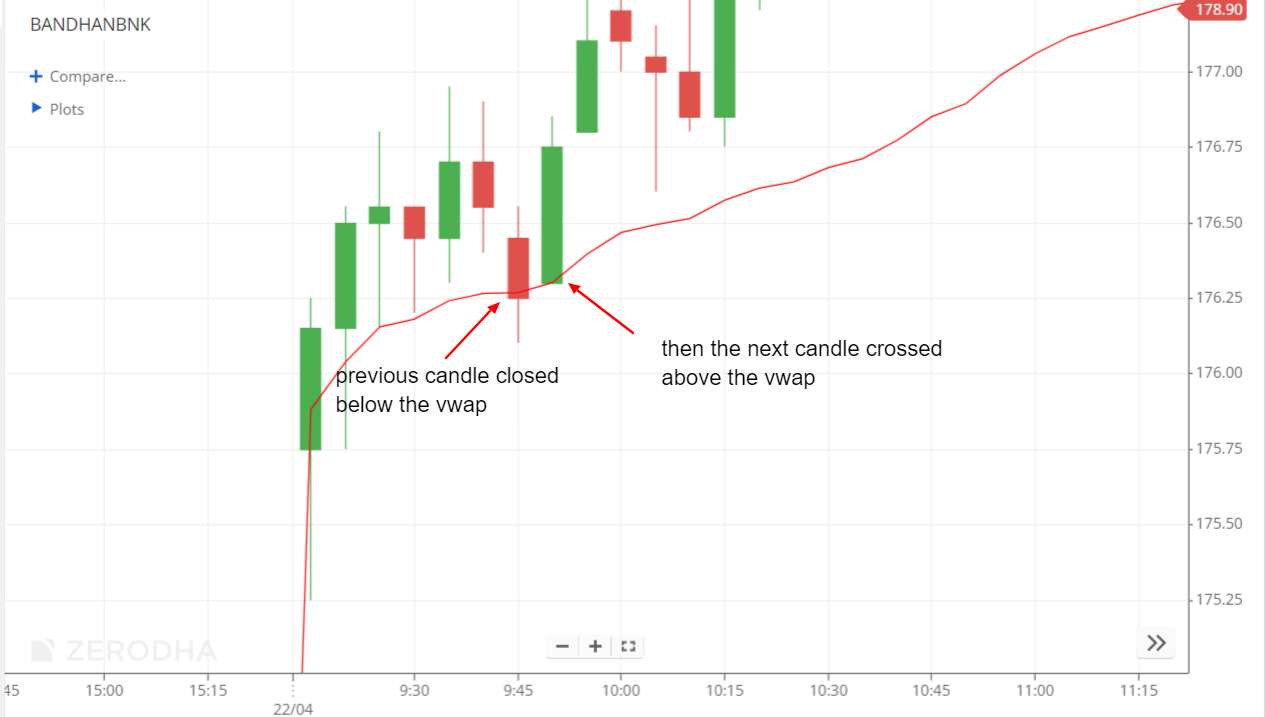 For example, you can check the result generated for the Bandhan bank at 9:55 where you can see the previous candle closing below the VWAP and the next candle crosses above the VWAP, hence the result was generated.