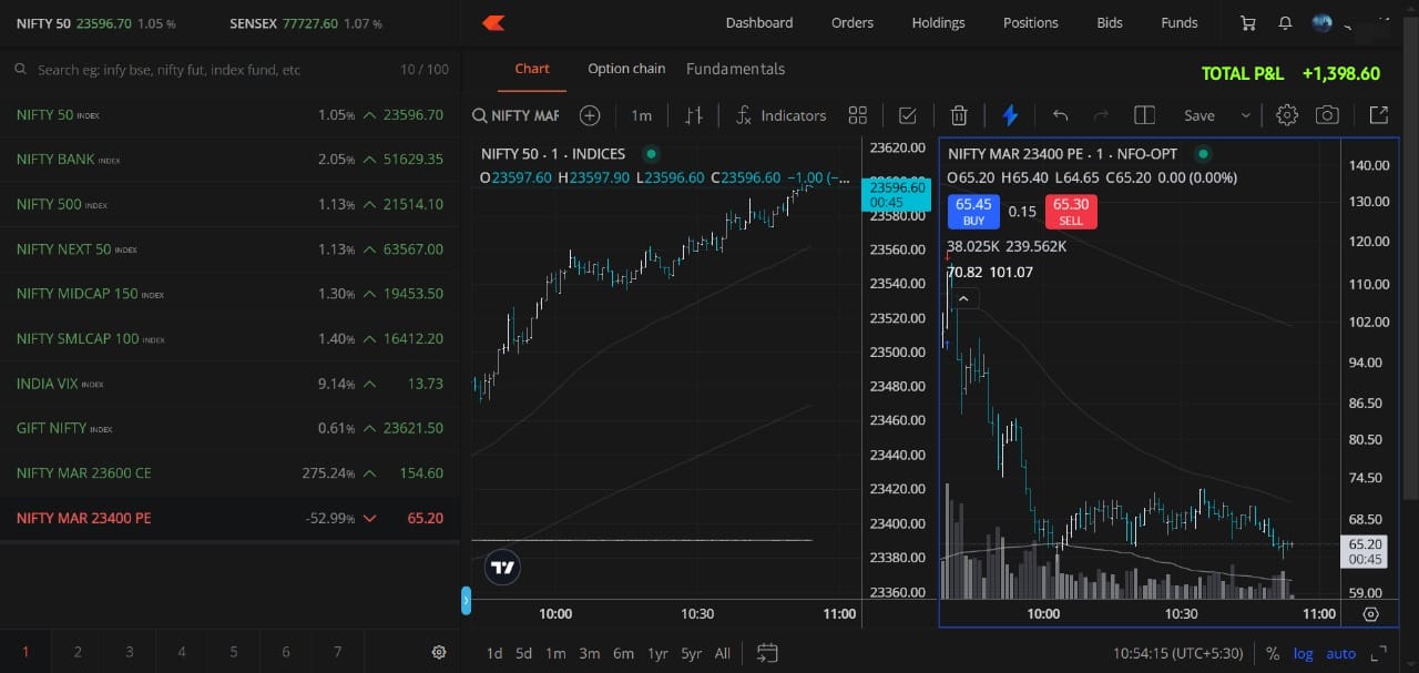 Modify order placement behavior – After enabling instant order placement, limit orders placed using the “+” button near the price scale execute directly, preventing quantity or price adjustments. It would be more useful if the “+” button prompted for confirmation, while the Buy/Sell box near the scrip name placed orders instantly.